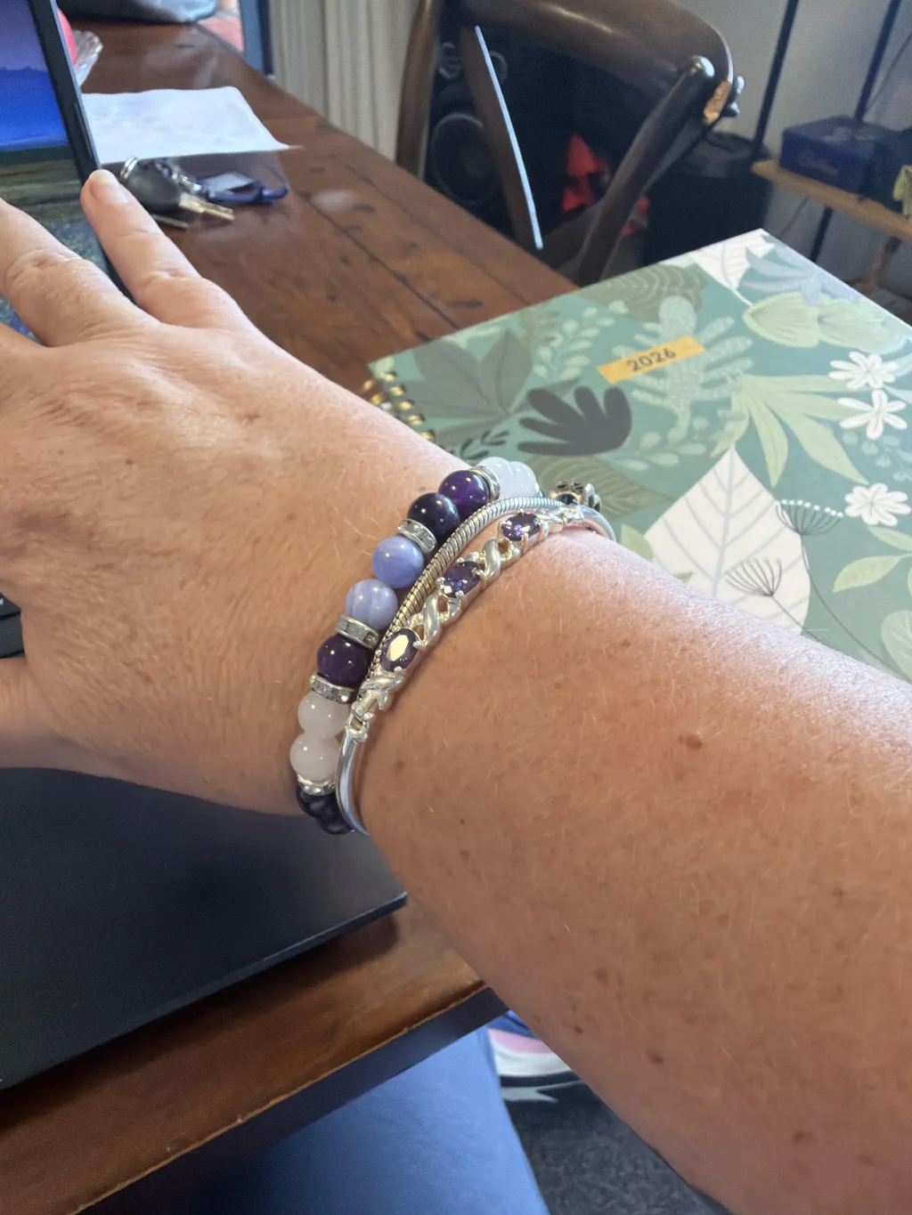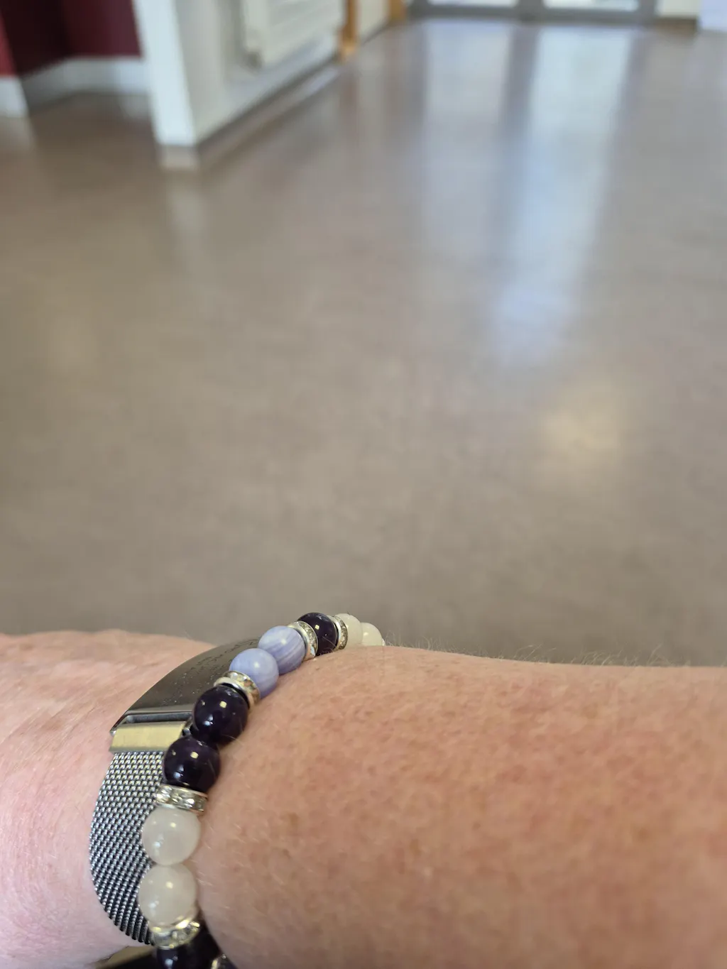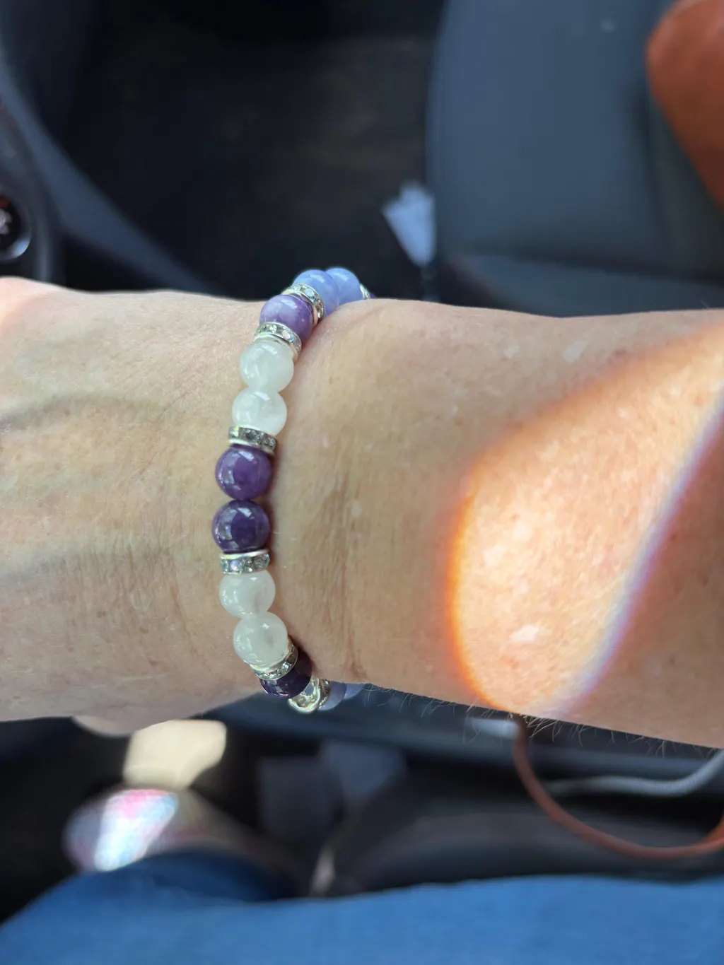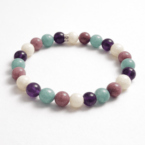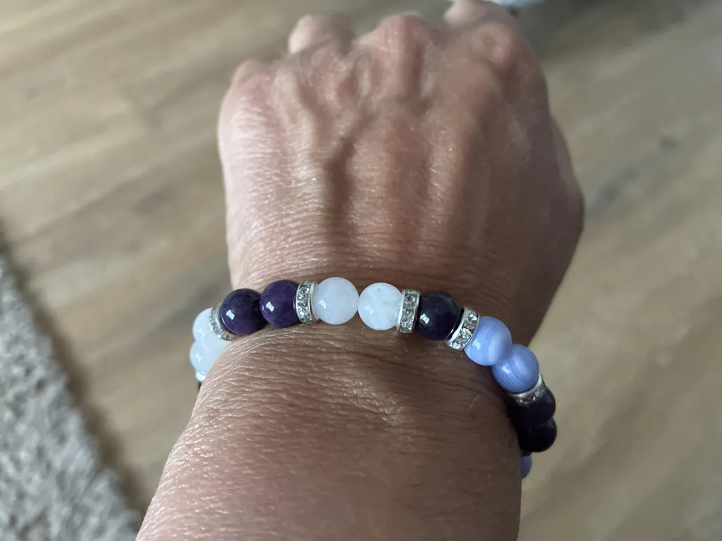 Because your stones are real. Every bead is cut from natural gemstone — not factory-made glass or resin. That means each Moonstone will shimmer slightly differently, each Amethyst will vary from light lavender to deep purple, and each Lepidolite will have its own unique sparkle. These natural variations are proof of authenticity, and they make your bracelet one of a kind.
